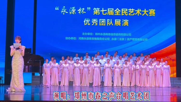 一个优秀的合唱团,必须要有一两个与众不同的、出类拔萃的、惊艳异常的、既有很高识别度又有突出代表性的王牌节目。那么,被誉为郑州合唱艺术领域第一先锋队的“春之声”合唱团的王牌节目是什么呢?就是中国第一首城市进行曲一一《有座城市叫郑州》。 10月29日下午,“春之声”合唱团又一次惊艳亮相艺术大赛(第七届“永源杯”全民艺术大赛),激情唱响又一座大剧院(小皇后大剧院),又一次生动演绎《有座城市叫郑州》。当天活动丰富多彩,该团表演独领风骚,其节目不仅是原创作品,而且是中英文双语朗诵加轮唱加二声部。现场合唱指挥由李丽蝶团长担任。 他们这一王牌节目不仅节奏鲜明、而且极富亲和力,是由中国音乐著作权协会会员陆进良先生创作完成,刊登于中共郑州市委宣传部机关刊物《郑州宣传》,成为郑州人民共同拥有的精神财富。 “春之声”合唱团全体人员盛装表演,以一种大气、洋气、帅气的舞台印象,给人带来非常优美的艺术享受。他们那高质量、高水平的音乐表演,唱出了郑州人民的共同心声,展现了郑州人民积极向上的精神风貌。